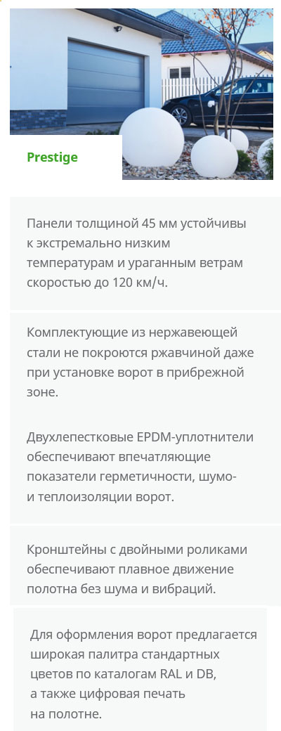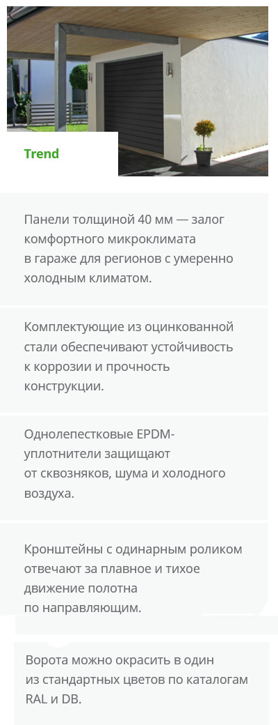 Серии секционных ворот: Престиж и Тренд, - имеют некоторые отличия и стоимость. Какая конкретно модель требуется Вам, можно понять, просмотрев сранительные характеристики серий. Подробная информация о воротах находится на странице моделей.